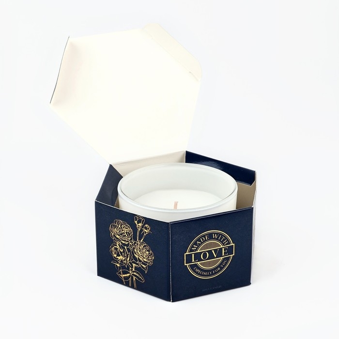 Свеча упакована в красивую шестигранную коробку синего цвета с золотистыми деталями. На коробке изображены цветы и листья, а также надпись "Aromatherapy Candle Home Fragrance Limited Edition".