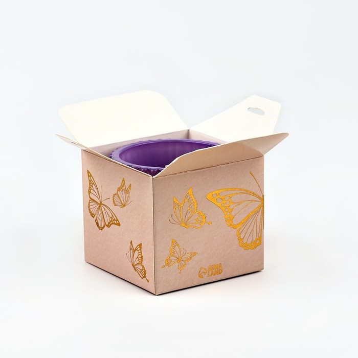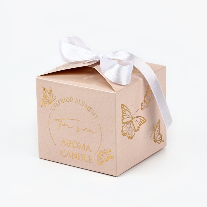 Свеча упакована в красивую картонную коробку светло-бежевого цвета с золотым изображением бабочек.