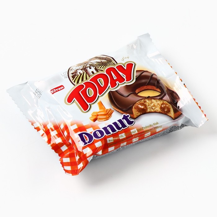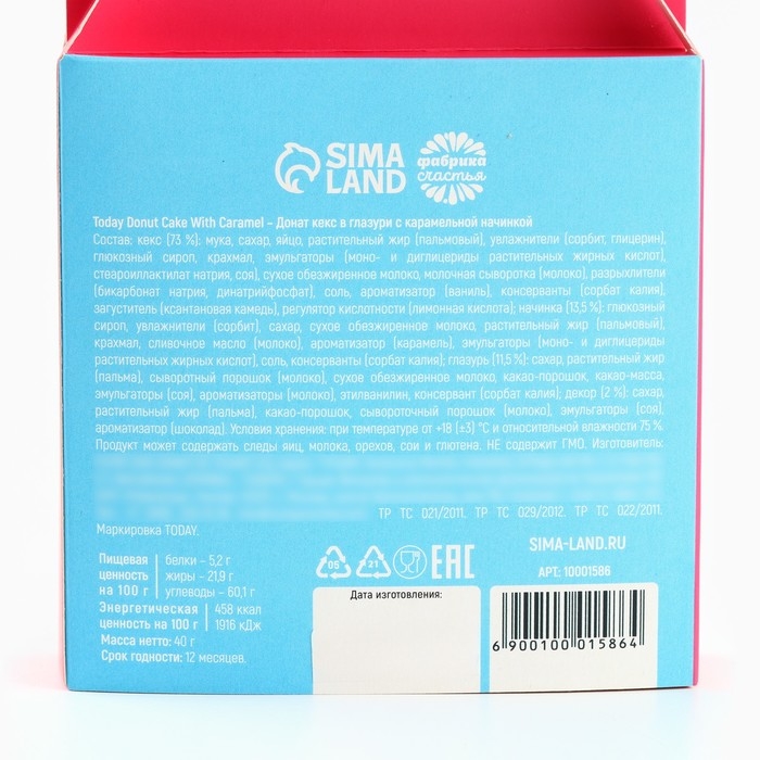 Состав: кекс (73 %): мука, сахар, яйцо, растительный жир (пальмовый), увлажнители (сорбит, глицерин), глюкозный сироп, крахмал, эмульгаторы (моно- и диглицериды растительных жирных кислот), стеароиллактилат натрия, соя), сухое обезжиренное молоко, молочная сыворотка (молоко), разрыхлители (бикарбонат натрия, динатрийфосфат), соль, ароматизатор (ваниль), консерванты (сорбат калия), загуститель (ксантановая камедь), регулятор кислотности (лимонная кислота); начинка (13,5 %): глюкозный сироп, увлажнители (сорбит), сахар, сухое обезжиренное молоко, растительный жир (пальмовый), крахмал, сливочное масло (молоко), ароматизатор (карамель), эмульгаторы (моно- и диглицериды растительных жирных кислот), соль, консерванты (сорбат калия); глазурь (11,5 %): сахар, растительный жир (пальма), сыворотный порошок (молоко), сухое обезжиренное молоко, какао-порошок, какао-масса, эмульгаторы (соя), ароматизаторы (молоко), этилванилин, консервант (сорбат калия); декор (2 %): сахар, растительный жир (пальма), какао-порошок, сывороточный порошок (молоко), эмульгаторы (соя), ароматизатор (шоколад).
