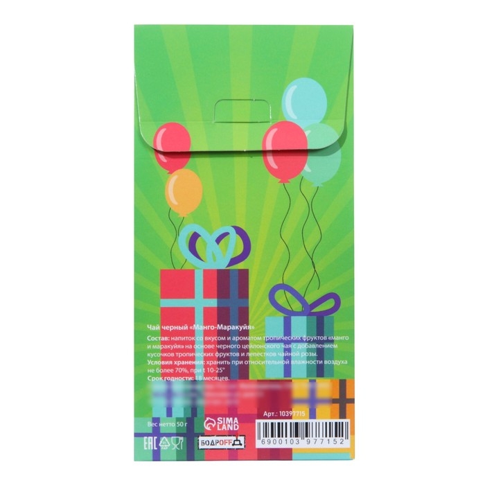 Чай упакован в подарочную коробку с праздничным оформлением. Такой презент будет уместно преподнести на день рождения.