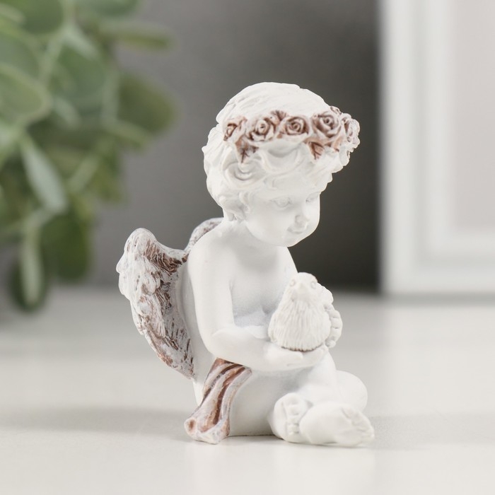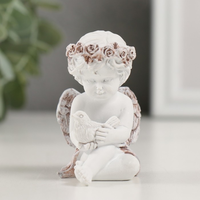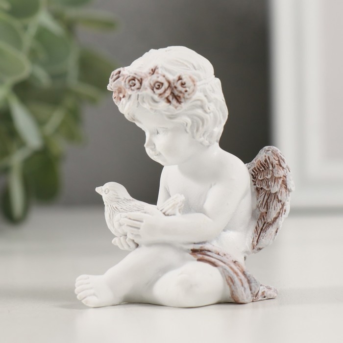 Сувенир полистоун "Ангелочек с птичкой в руках" кофейный венок 5,5х4,5х6,5 см