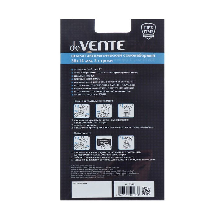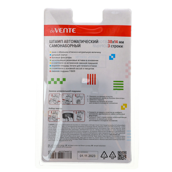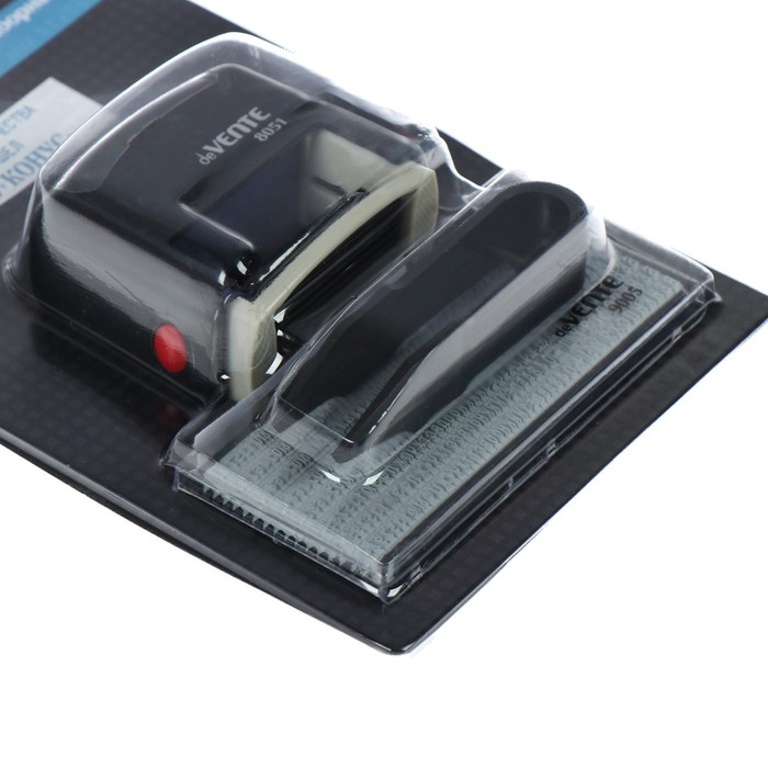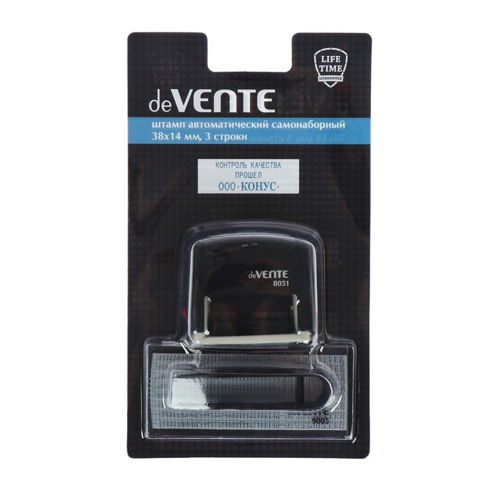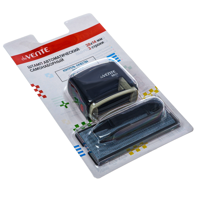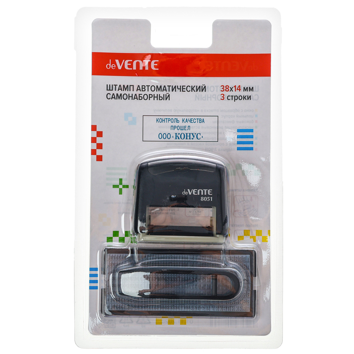 Штамп автоматический самонаборный "deVENTE" 8051, 3-х строчный, 38x14 мм, в комплекте с основной кассой и пинцетом, в блистере.