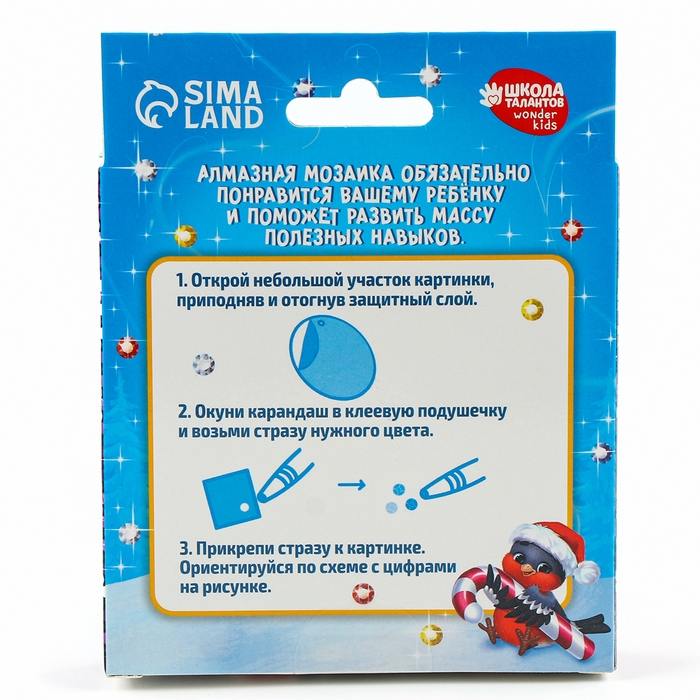 Чтобы получить сверкающую картинку, ребёнку предстоит разложить кристаллики специальным карандашом по схеме. Основа с клеевым покрытием будет надёжно удерживать стразы.