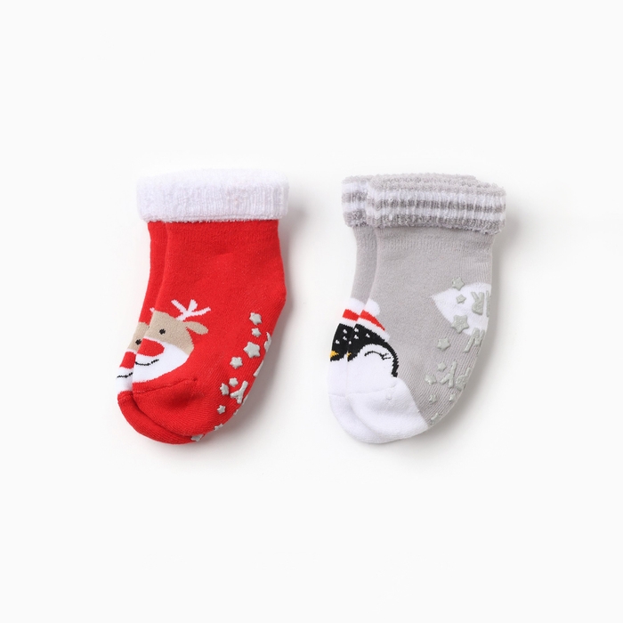 Новый год. Набор махровых носков Крошка Я "Пингвин и Олененок", 2 пары, размер 12-14 см