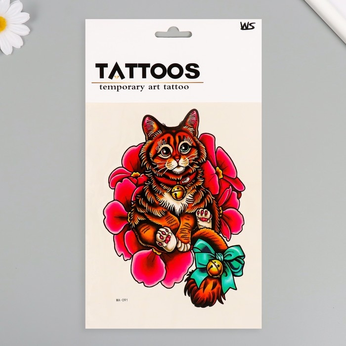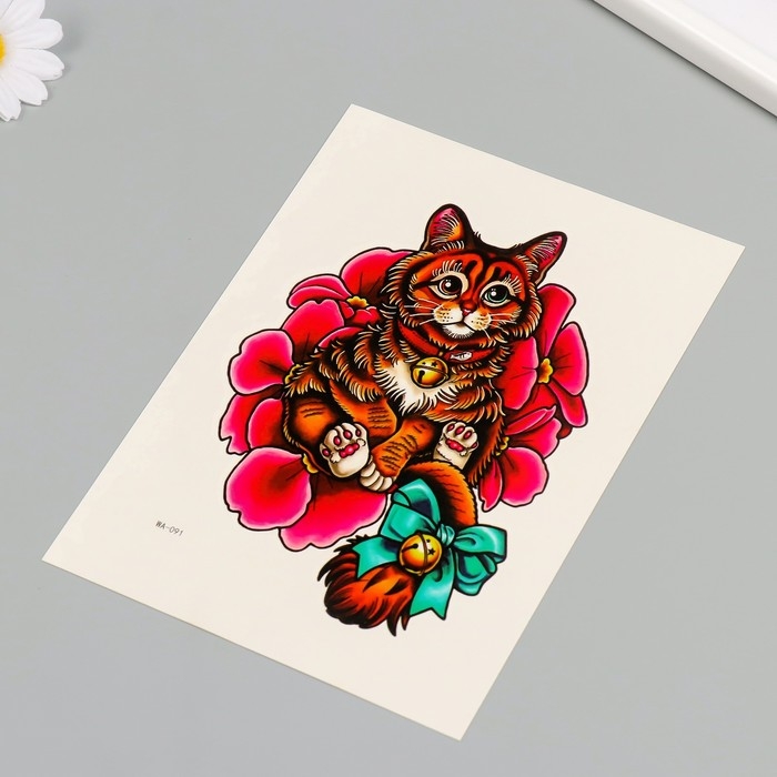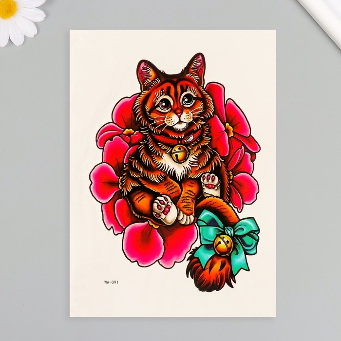 Татуировка на тело цветная "Котик с бубенцом" 26,1х14,6 см
