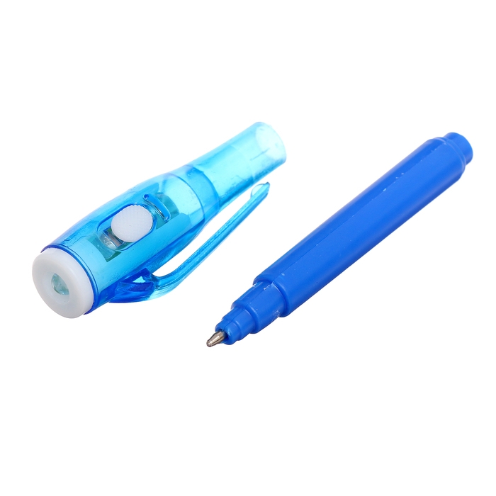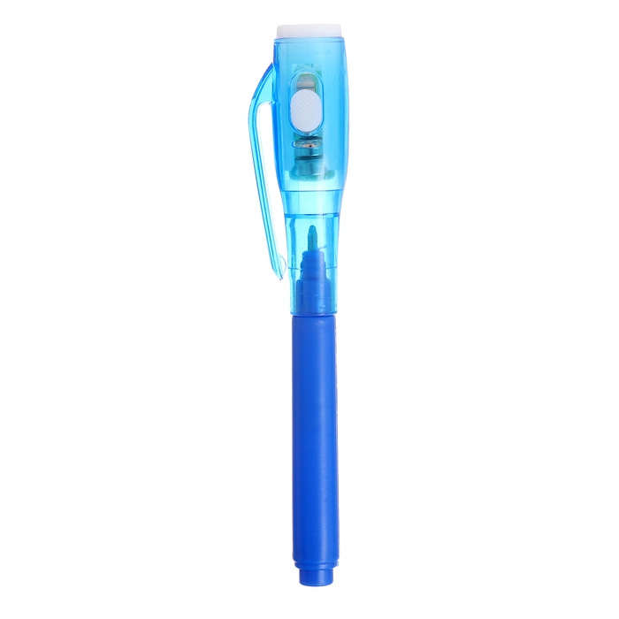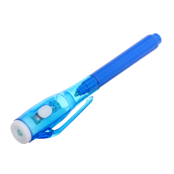 - У ручки-фонарика есть ещё одна функция — невидимые чернила. Снимите колпачок и напишите что-нибудь на листе бумаги, а затем посветите на надпись фонариком. Рисунок проявится.