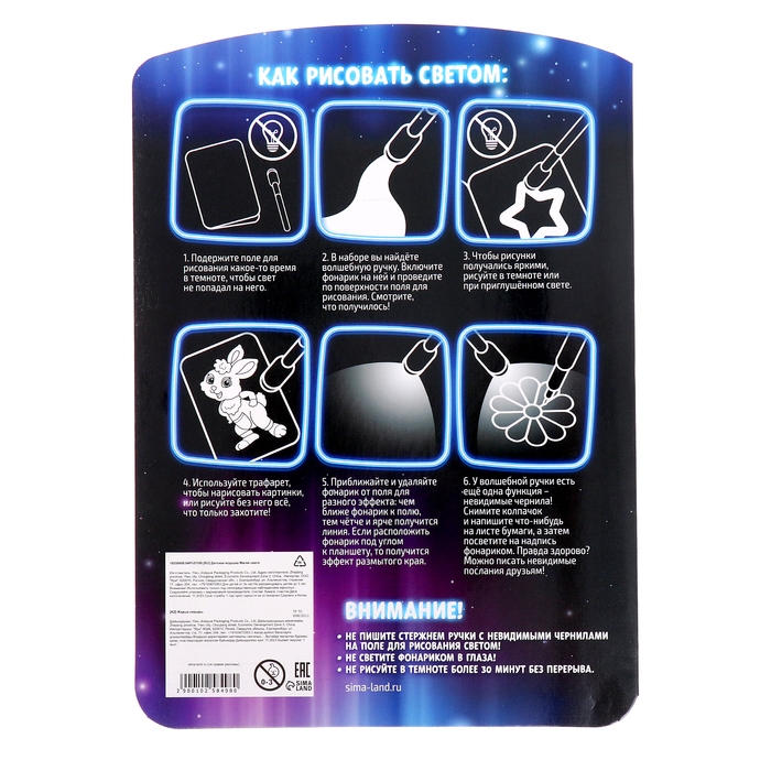 Всё, что пригодится для этого, уже есть в комплекте: поле для рисования, трафареты, специальная ручка и фонарик.