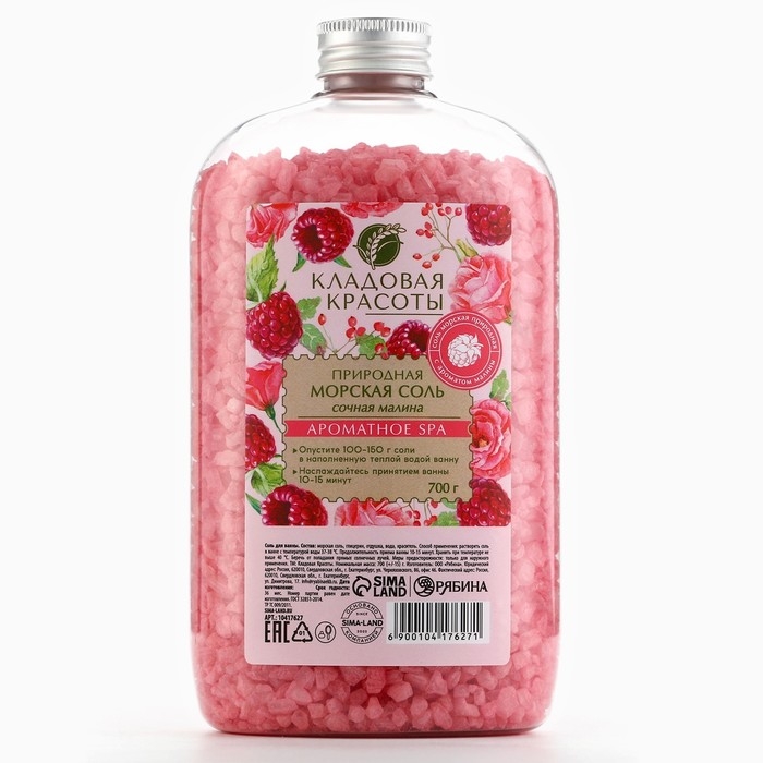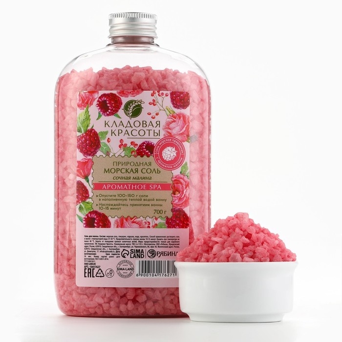 Природная морская соль для ванны, 700 г, аромат малины, КЛАДОВАЯ КРАСОТЫ