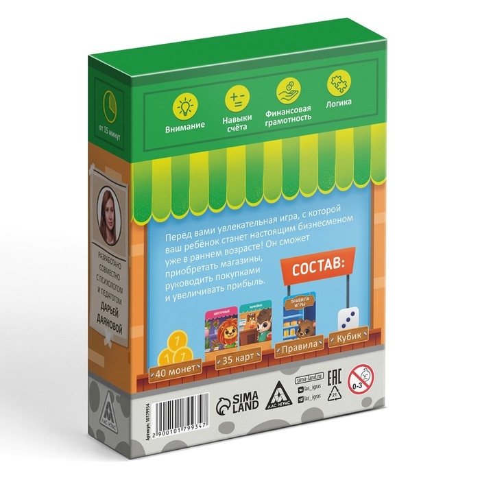 Перед вами увлекательная игра, с которой ваш ребёнок станет настоящим бизнесменом уже с раннего возраста! Он сможет приобретать магазины, руководить покупками и увеличивать прибыль. Что для этого нужно? Получайте карточки, бросайте кубик, собирайте игровые монеты и побеждайте соперников!