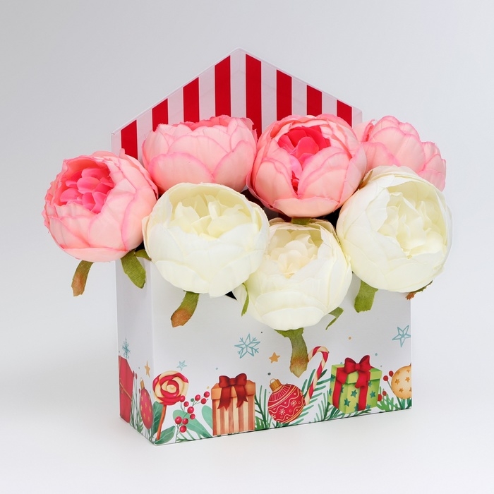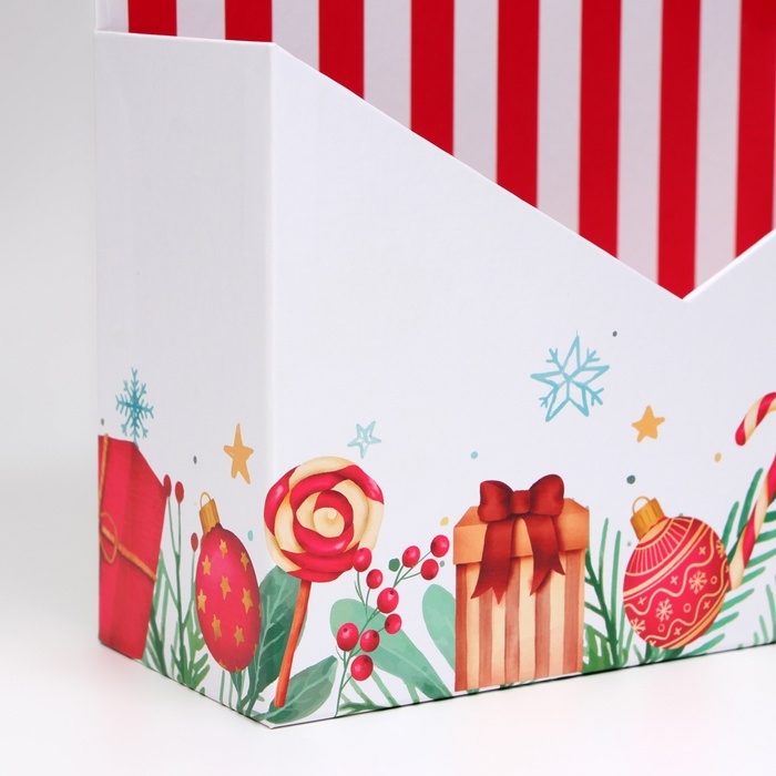 Коробка подходит для упаковки цветов, новогодних букетов, различных сладостей, конфет, шоколада, игрушек, сувениров, парфюмерии, новогодних подарков и других приятных мелочей.