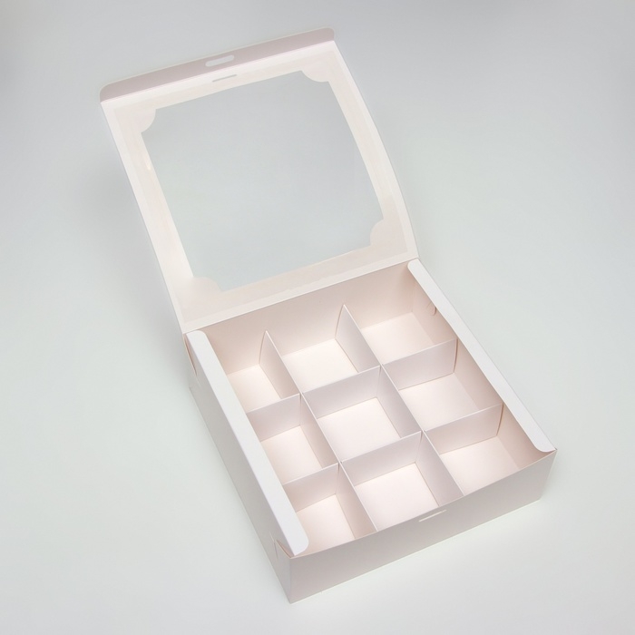 Внутреннее пространство разделено на девять ячеек, что позволяет удобно разместить каждое пирожное или капкейк отдельно.