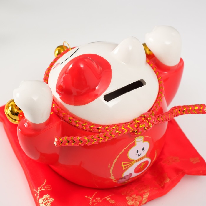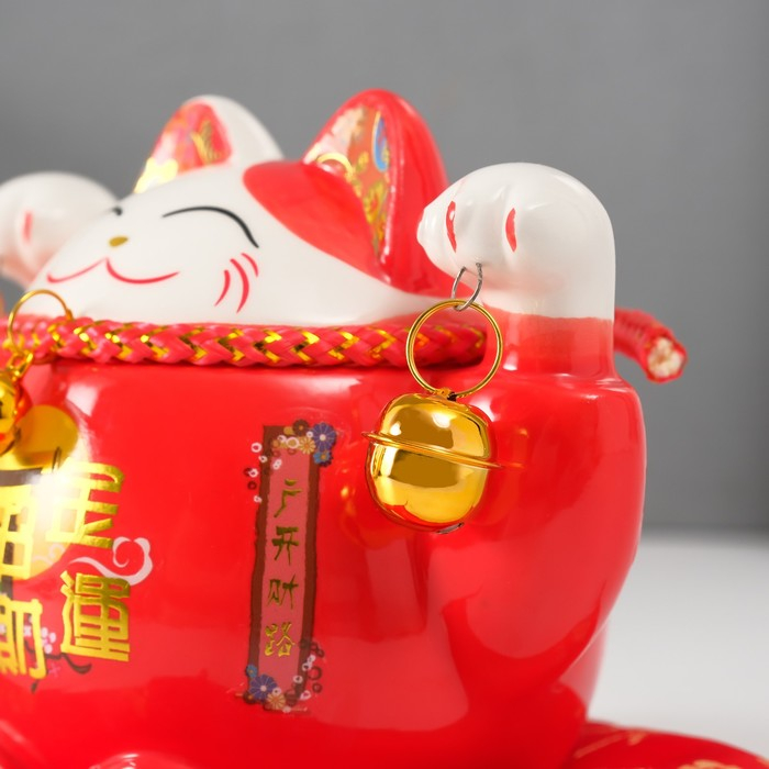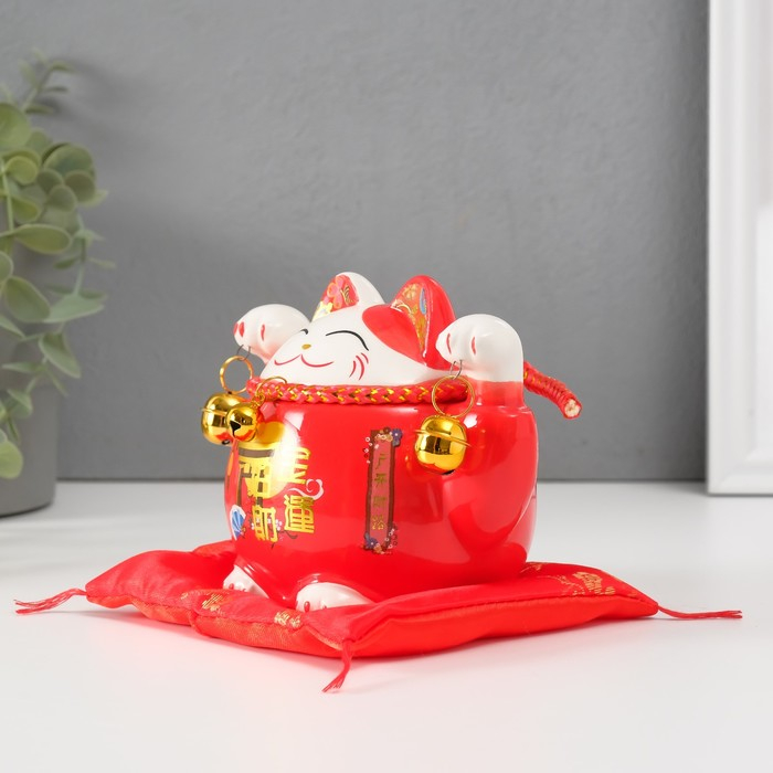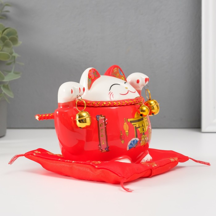 Копилка керамика "Кот манэки-нэко красный с колокольчиками" 10,5х13,5х9 см