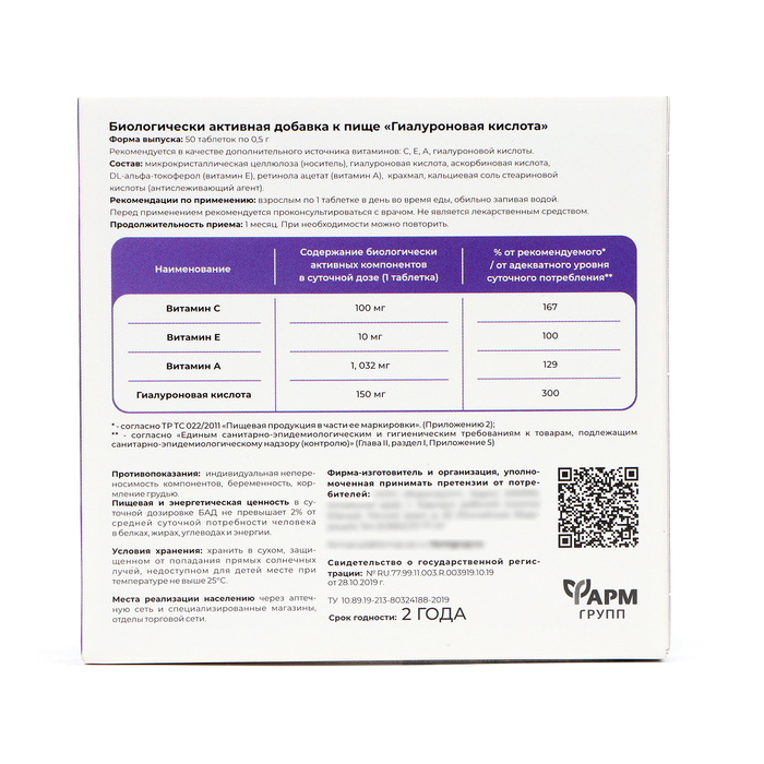 Состав: микрокристаллическая целлюлоза (носитель), гиалуроновая кислота, аскорбиновая кислота, DL-альфа-токоферол (витамин E), ретинола ацетат (витамин А), крахмал картофельный, кальциевая соль стеариновой кислоты (антислеживающий агент).