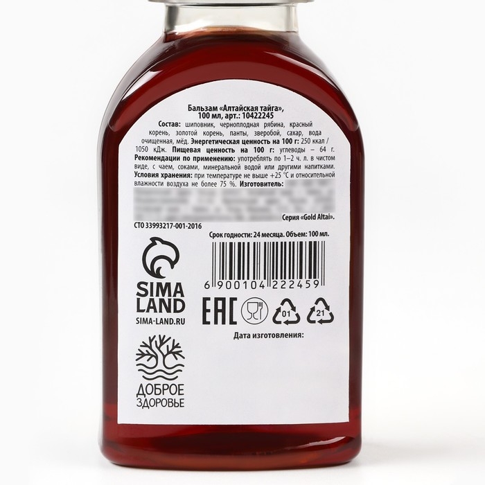 Состав: шиповник, черноплодная рябина, красный корень, золотой корень, панты, зверобой, сахар, вода очищенная, мёд.