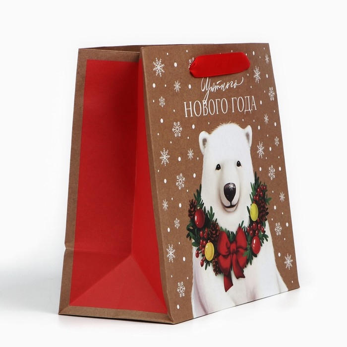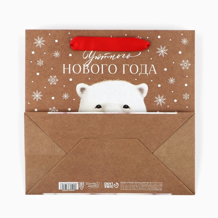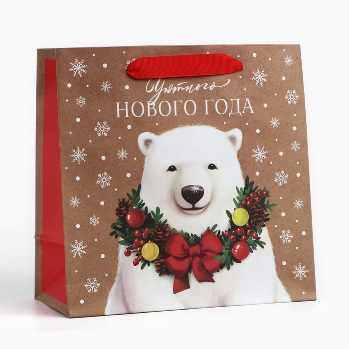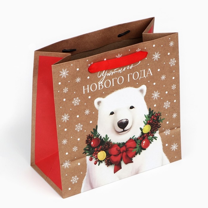 Пакет подарочный новогодний крафтовый квадратный «Новогодний мишка», 22 х 22 х 11 см, Новый год