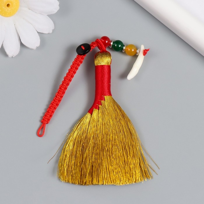 Подвеска текстиль "Золотая метла с клыком. Иероглиф - Счастье" 14,5 см