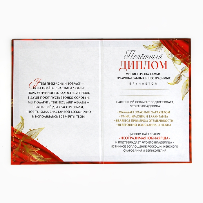 Праздничный диплом — прекрасный вариант оригинального поздравления. Изящные изображения, тёплые искренние слова, поле для имени получателя и список достижений — вот яркие черты этого аксессуара.