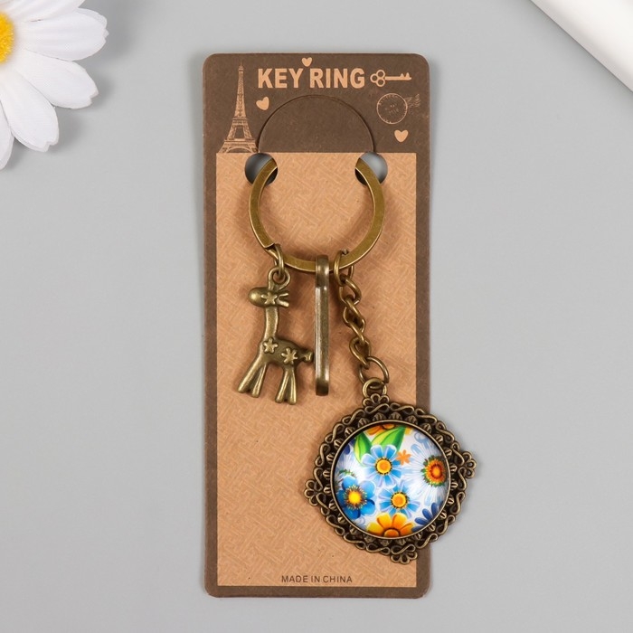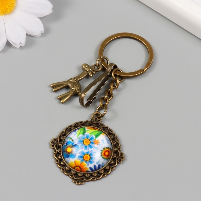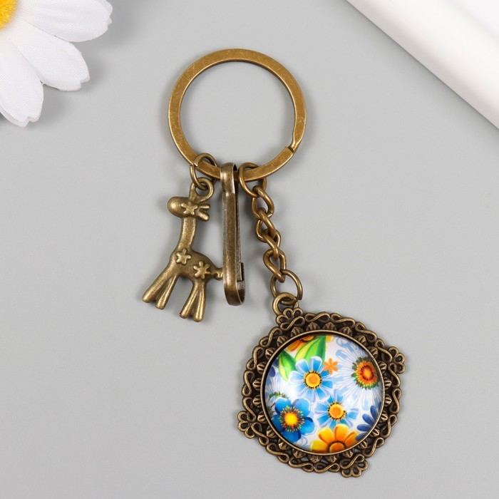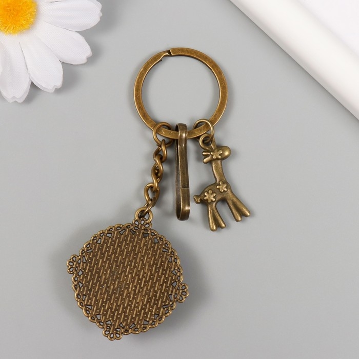 Брелок металл, стекло с карабином "Жирафик и цветы в медальоне" бронза 9,5 см