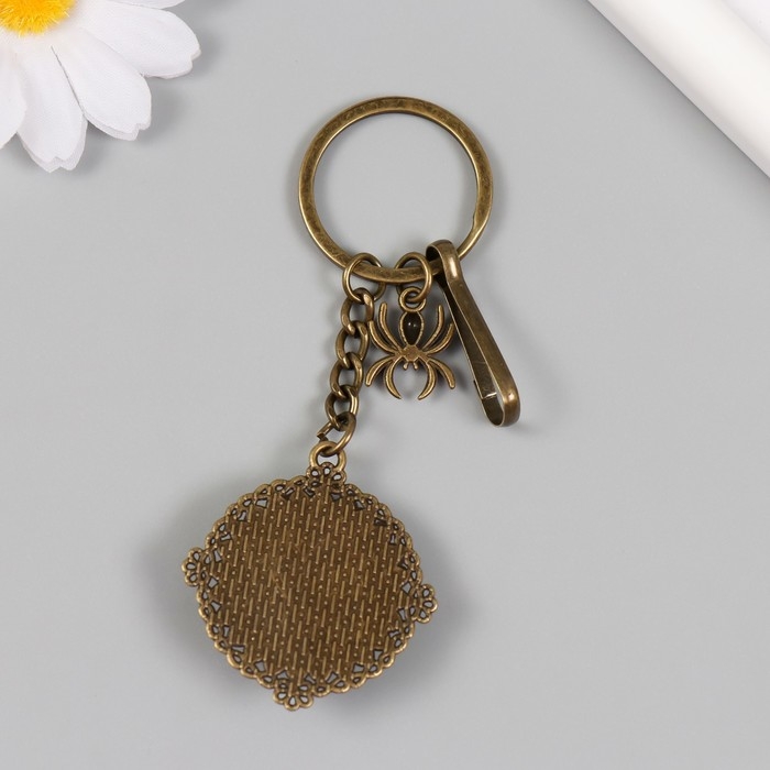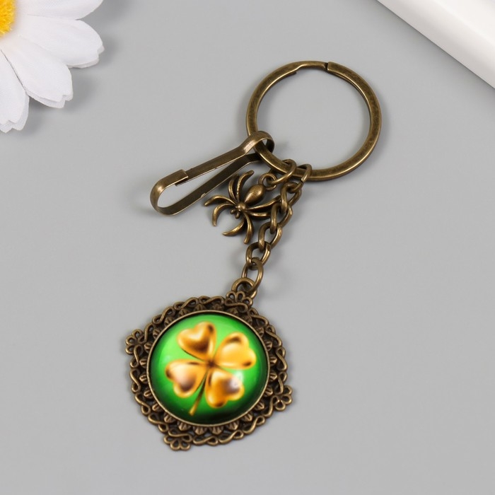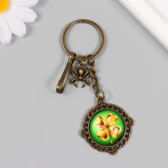 Брелок металл, стекло с карабином "Паучок и клевер в медальоне" бронза 9,5 см