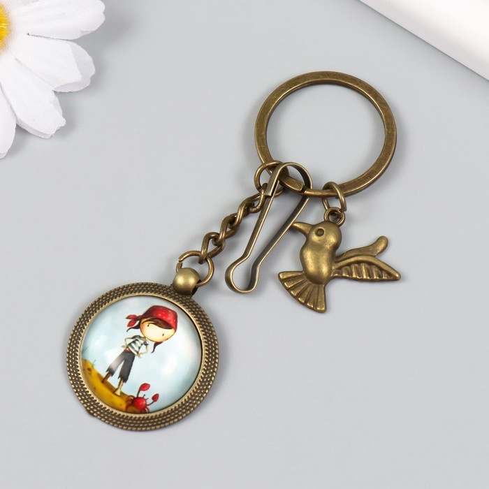 Брелок металл, стекло с карабином "Птица и девочка-пиратка в медальоне" бронза 9,5 см