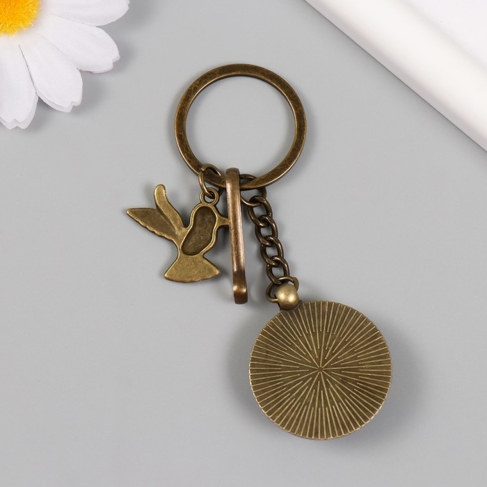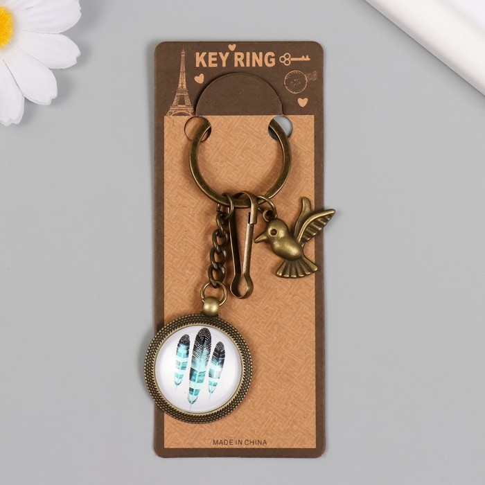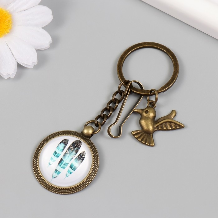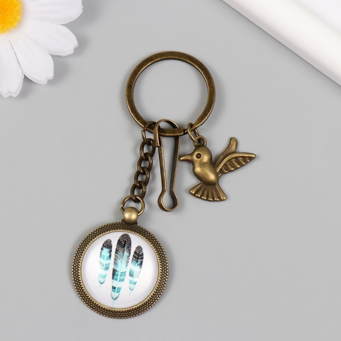 Брелок металл, стекло с карабином "Птица и перья в медальоне" бронза 9,5 см