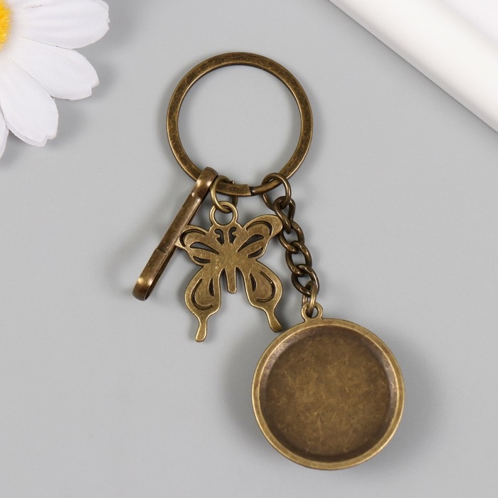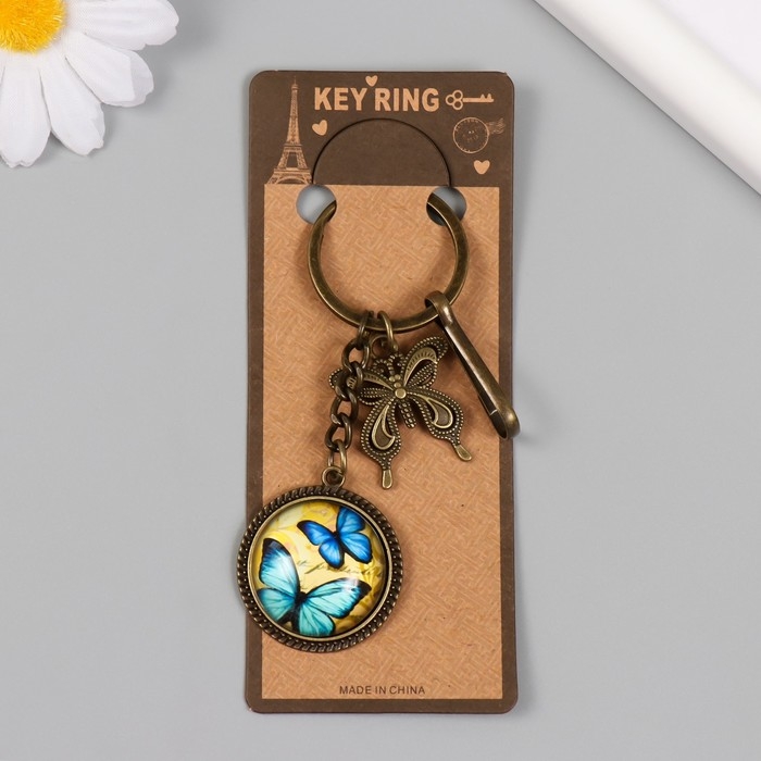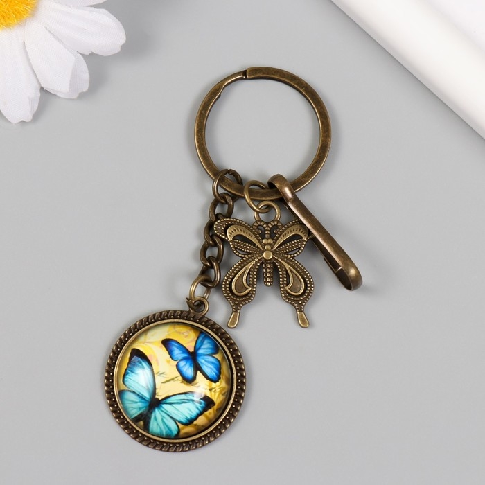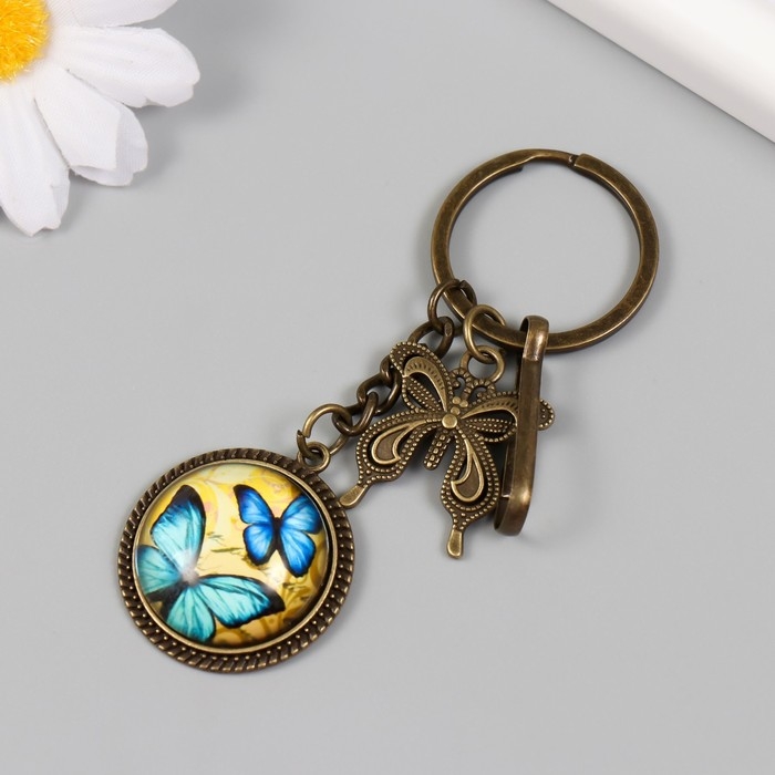 Брелок металл, стекло с карабином "Бабочки в медальоне" бронза 9,5 см