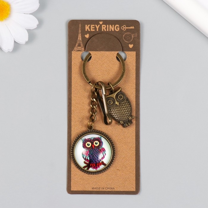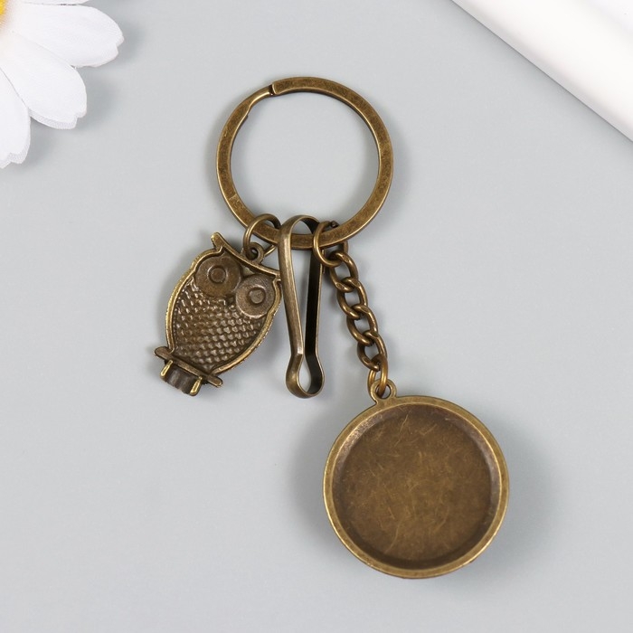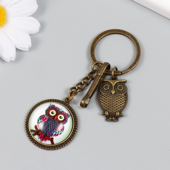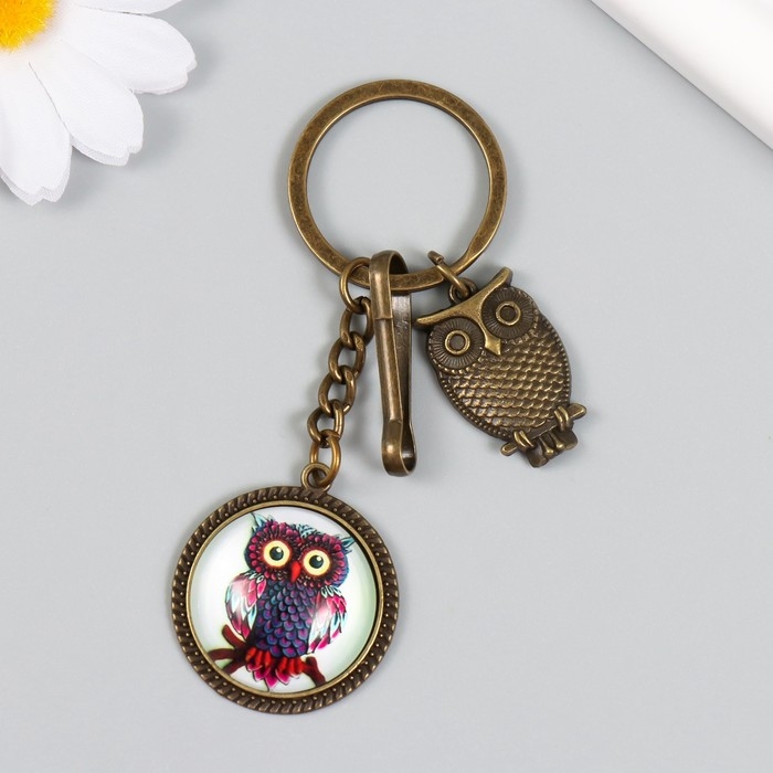 Брелок металл, стекло с карабином "Филин в медальоне" бронза 9,5 см