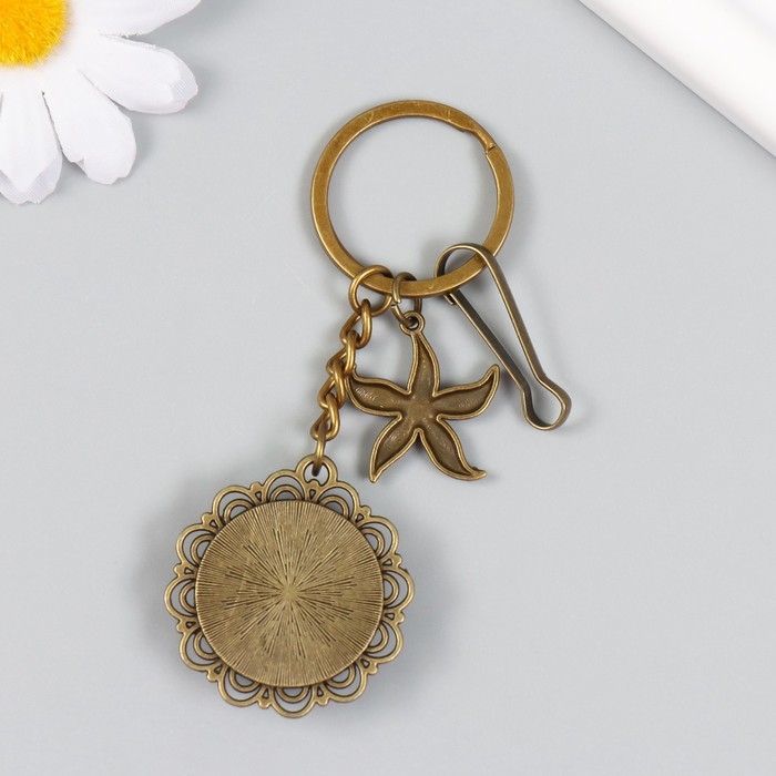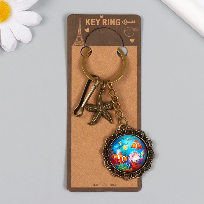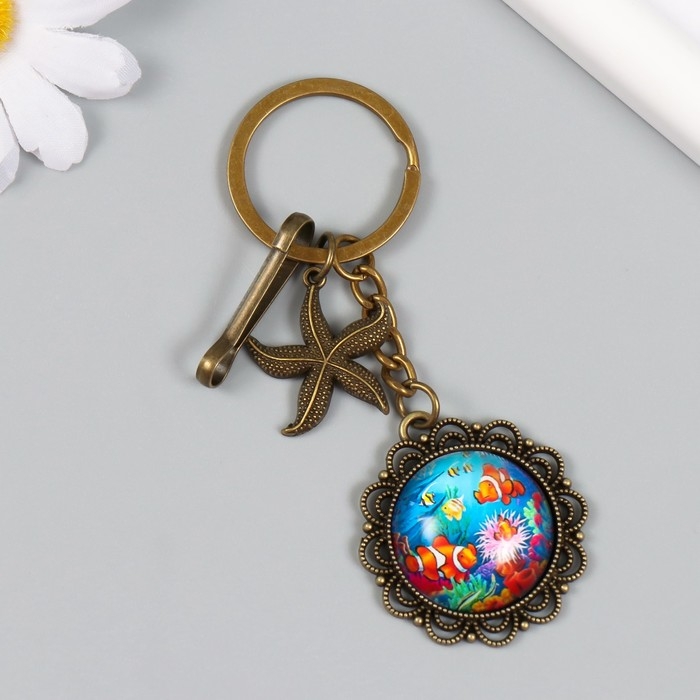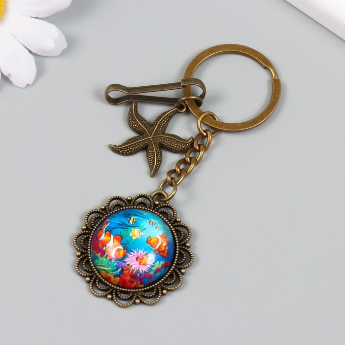 Брелок металл, стекло с карабином "Морская звезда и рыбки в медальоне" бронза 9,5 см