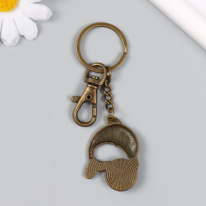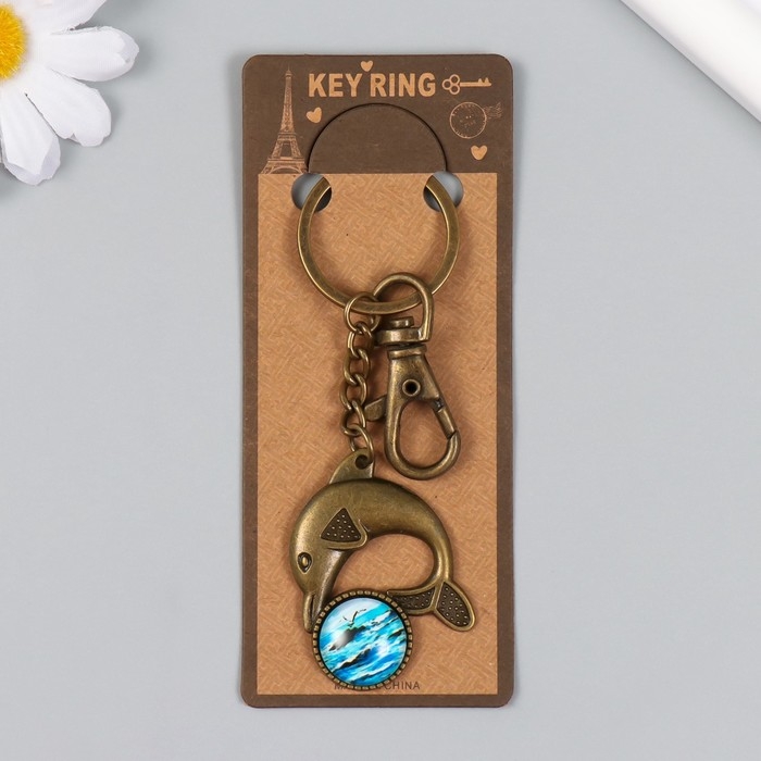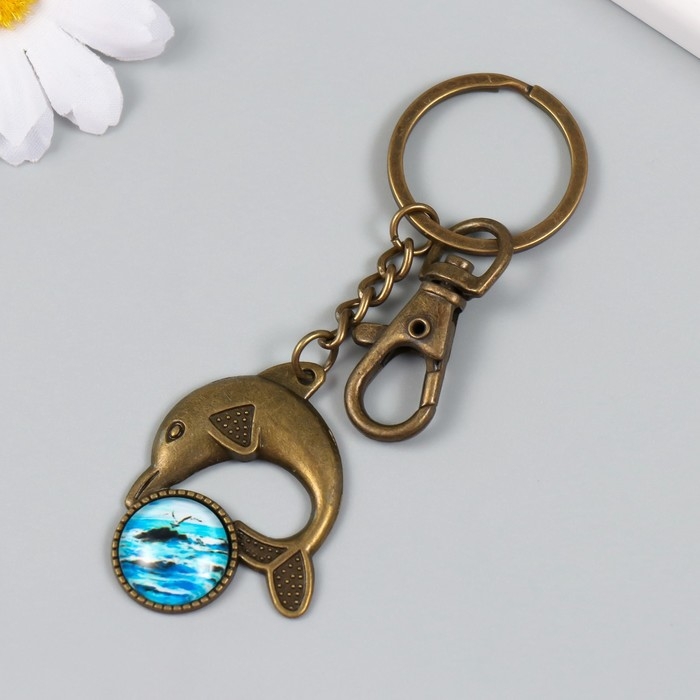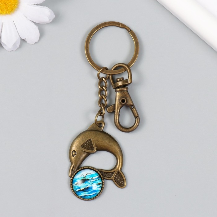 Брелок металл, стекло с карабином "Дельфин и море" бронза 9,8 см
