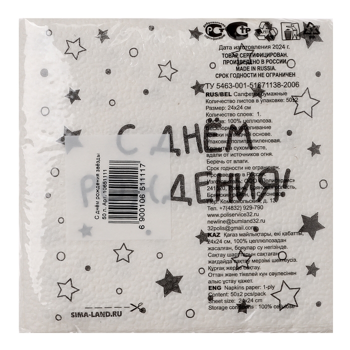 Салфетки бумажные однослойные "С днём рождения" звёзды, 24х24 см, набор 50 шт.