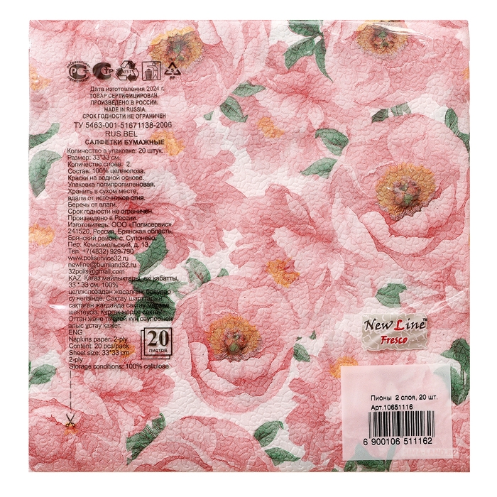 Салфетки бумажные двухслойные "Пионы", 33х33 см, набор 20 шт.