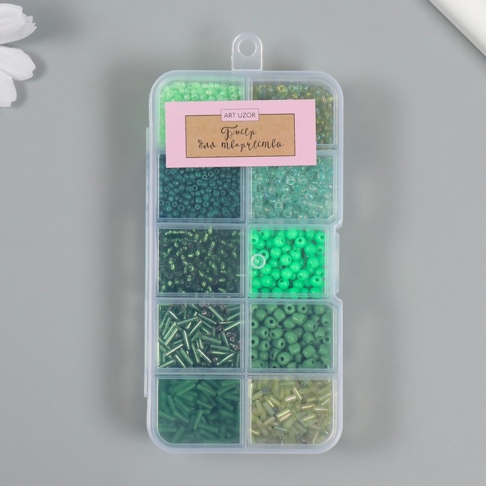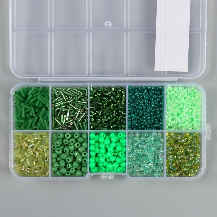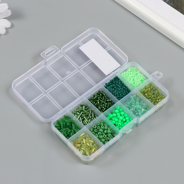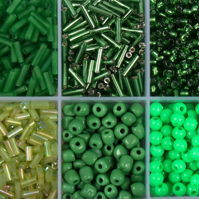 Бисер стекло 2/0, 6/0, 8/0, 12/0 в шкатулке "Зелёный" стеклярус 12,5х6,5х2 см
