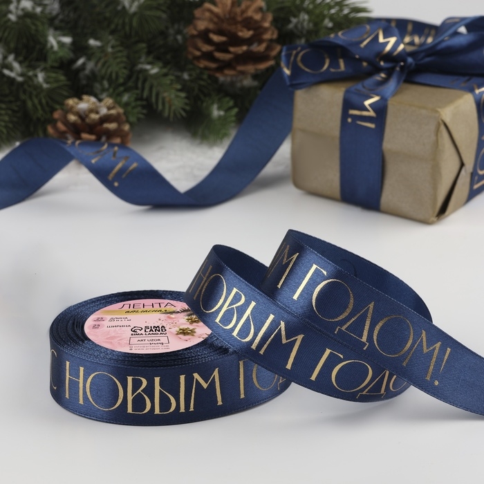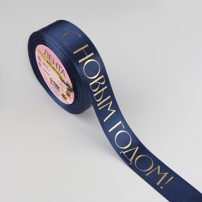Новый год! Лента атласная с тиснением «С Новым годом», 25 мм, 23 ± 1 м, цвет тёмно-синий