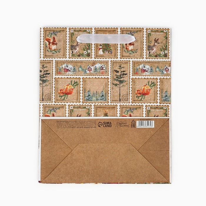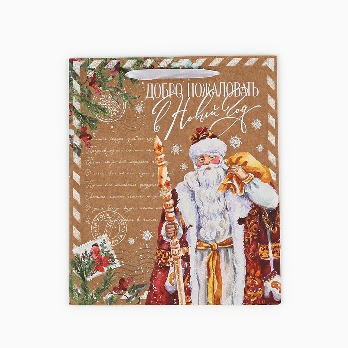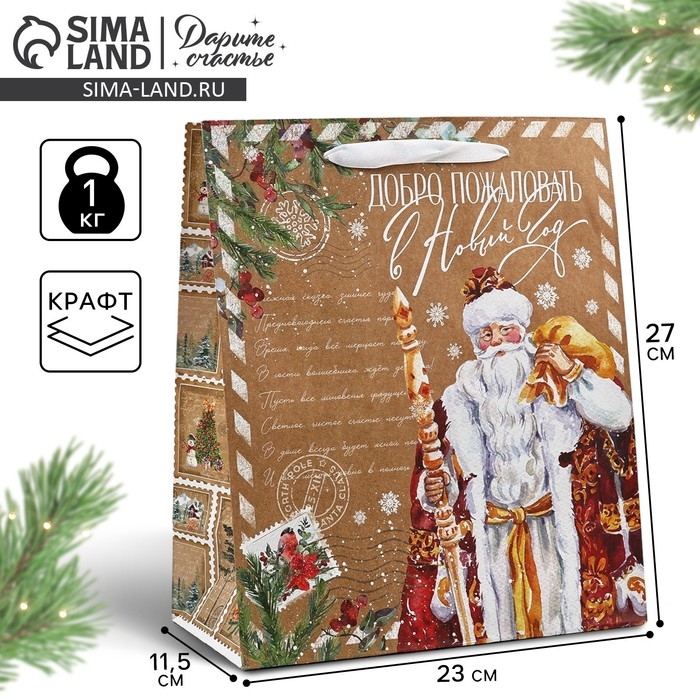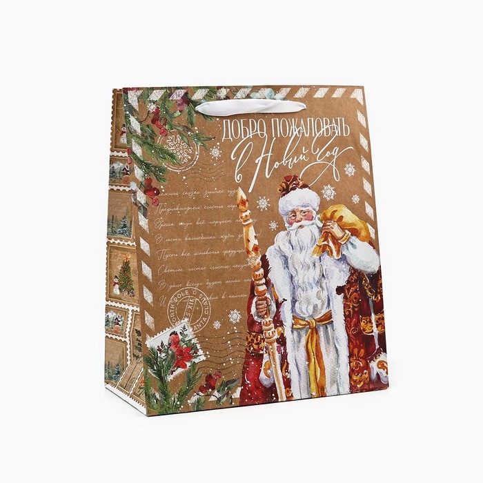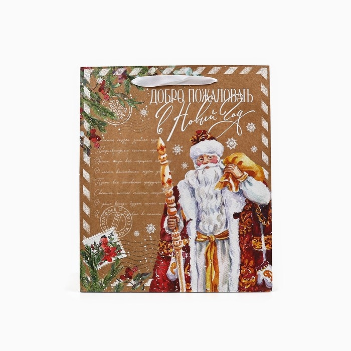 Пакет подарочный новогодний крафтовый вертикальный «Добро пожаловать в Новый год», ML 23 х 27 х 11.5 см , Новый год