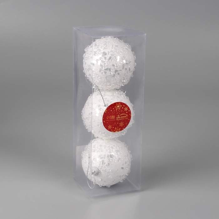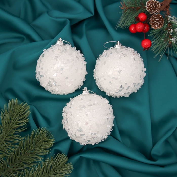 Набор шаров пластик d-8 см, 3 шт "Альваро" блёстки, белый
