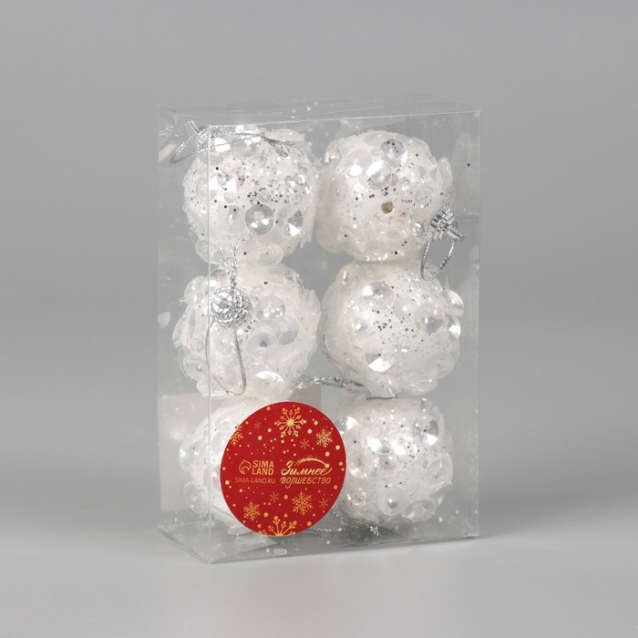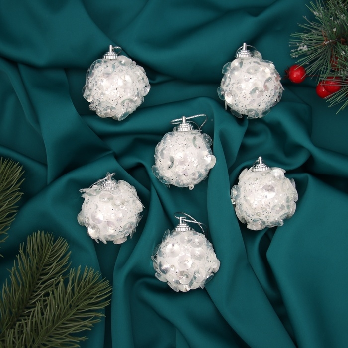 Набор шаров пластик d-5 см, 6 шт "Альваро" пайетки, белый