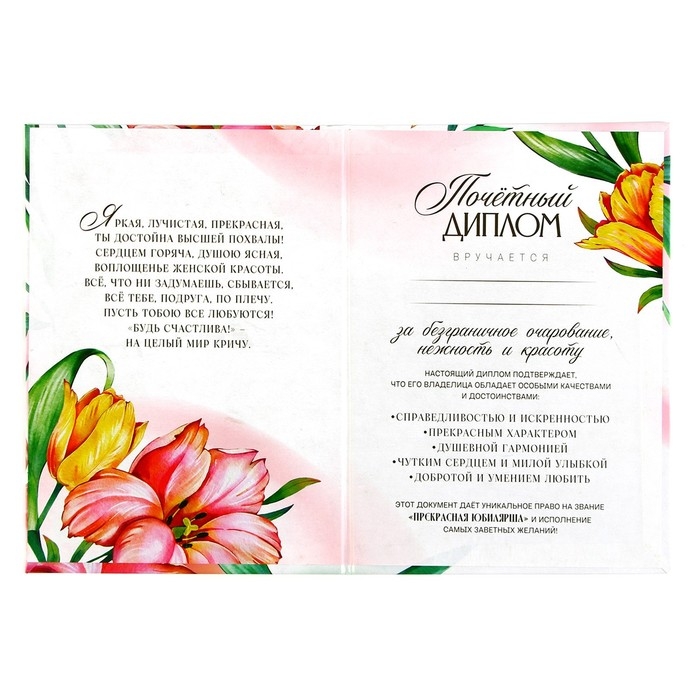 Праздничный диплом — прекрасный вариант оригинального поздравления. Изящные изображения, тёплые искренние слова, поле для имени получателя и список достижений — вот яркие черты этого аксессуара. На любом празднике приветствуются как официальные поздравления, так и шуточные. Креативное дизайнерское решение и невероятно позитивное содержание диплома удивят виновника торжества и зарядят присутствующих положительными эмоциями. Изделие выполнено из качественного ламинированного картона и бумаги.