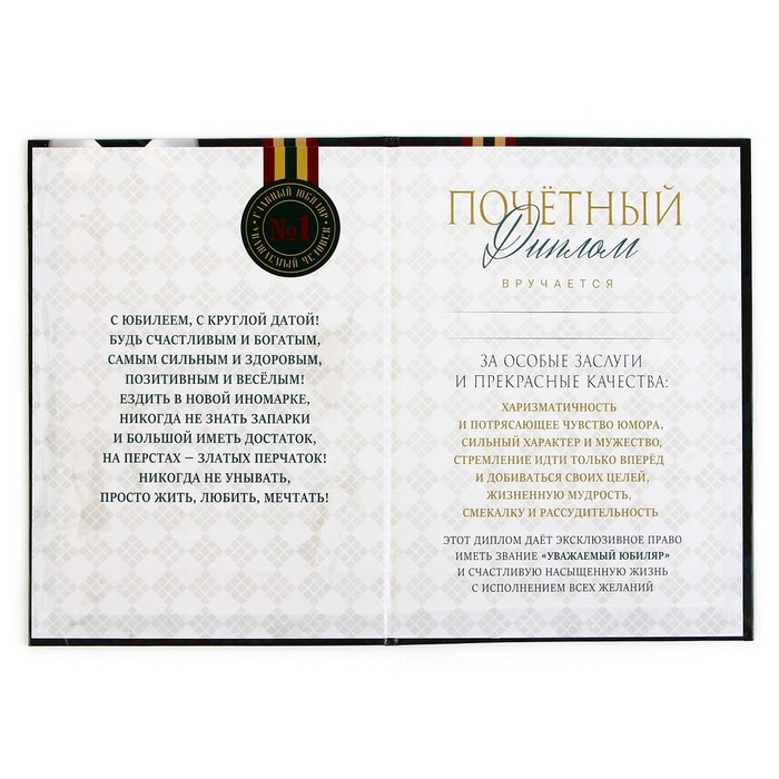 Праздничный диплом — прекрасный вариант оригинального поздравления. Изящные изображения, тёплые искренние слова, поле для имени получателя и список достижений — вот яркие черты этого аксессуара. На любом празднике приветствуются как официальные поздравления, так и шуточные. Креативное дизайнерское решение и невероятно позитивное содержание диплома удивят виновника торжества и зарядят присутствующих положительными эмоциями. Изделие выполнено из качественного ламинированного картона и бумаги.