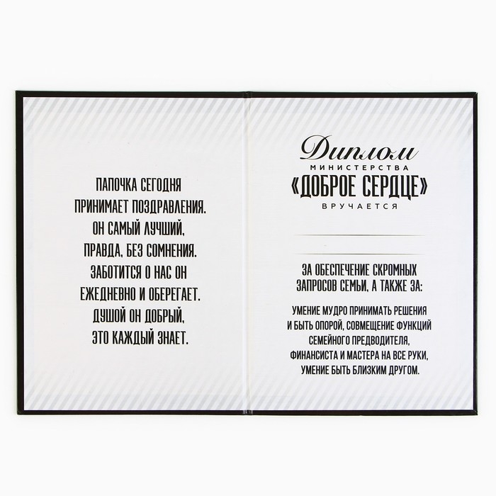 Праздничный диплом — прекрасный вариант оригинального поздравления. Изящные изображения, тёплые искренние слова, поле для имени получателя и список достижений — вот яркие черты этого аксессуара. На любом празднике приветствуются как официальные поздравления, так и шуточные. Креативное дизайнерское решение и невероятно позитивное содержание диплома удивят виновника торжества и зарядят присутствующих положительными эмоциями. Изделие выполнено из качественного ламинированного картона и бумаги.