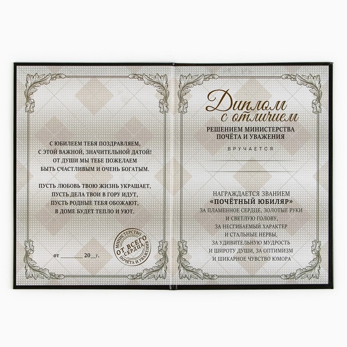 Праздничный диплом — прекрасный вариант оригинального поздравления. Изящные изображения, тёплые искренние слова, поле для имени получателя и список достижений — вот яркие черты этого аксессуара. На любом празднике приветствуются как официальные поздравления, так и шуточные. Креативное дизайнерское решение и невероятно позитивное содержание диплома удивят виновника торжества и зарядят присутствующих положительными эмоциями. Изделие выполнено из качественного ламинированного картона и бумаги.