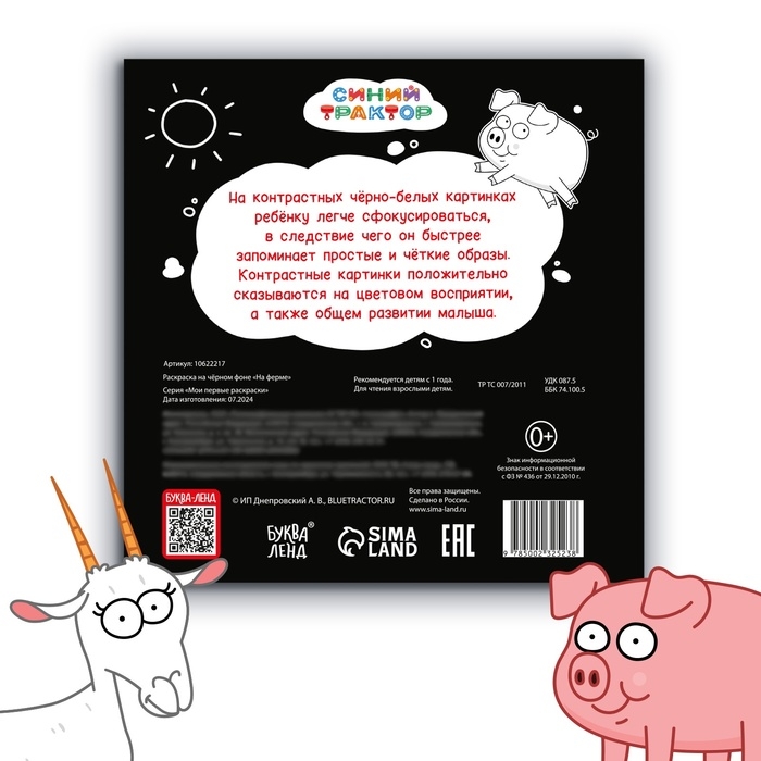 Раскраска на чёрном фоне «На ферме», 19 × 19 см, 16 стр., Синий трактор