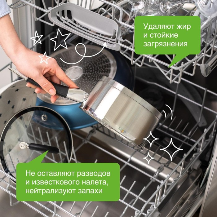 Таблетки предназначены для мытья посуды, в том числе детской, и столовых приборов в посудомоечных машинах любого типа. Комплекс растительных Н-тензидов, полученных из растительных масел, и энзимов без ГМО эффективно размягчает и удаляет стойкие и сложные загрязнения, растворяет жир, качественно и бережно очищает посуду и столовые приборы.