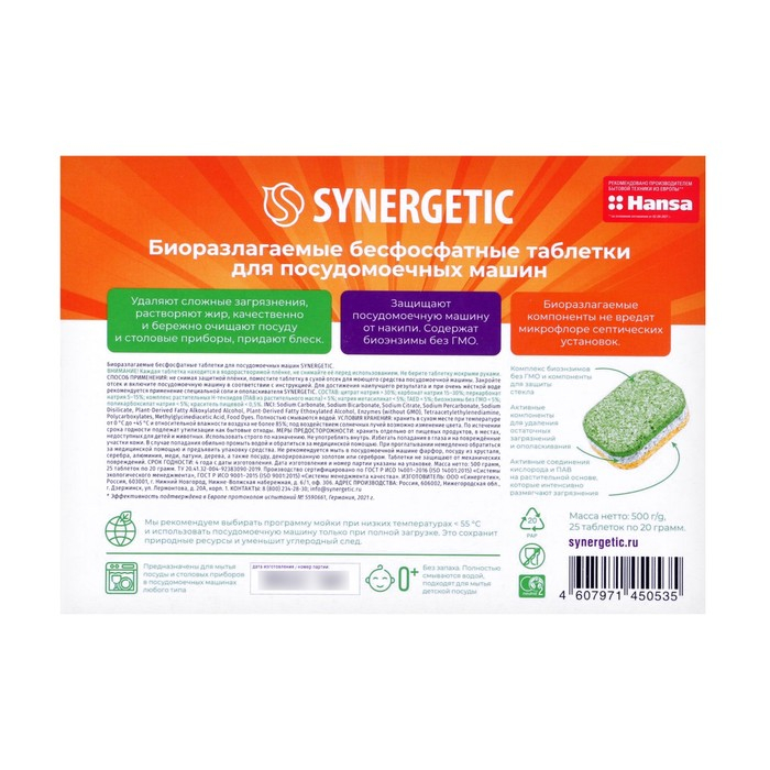 Таблетки для посудомоечных машин "Synergetic", бесфосфатные,биоразлагаемые,25 шт.