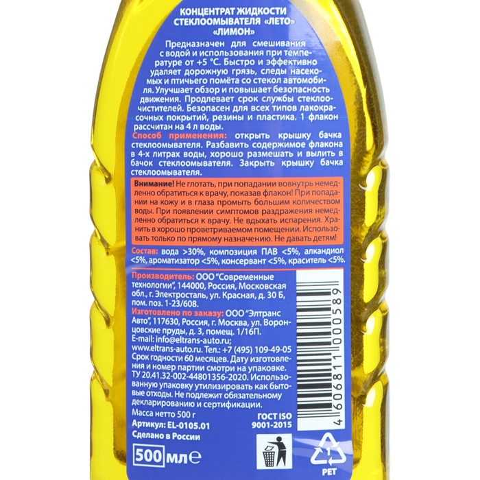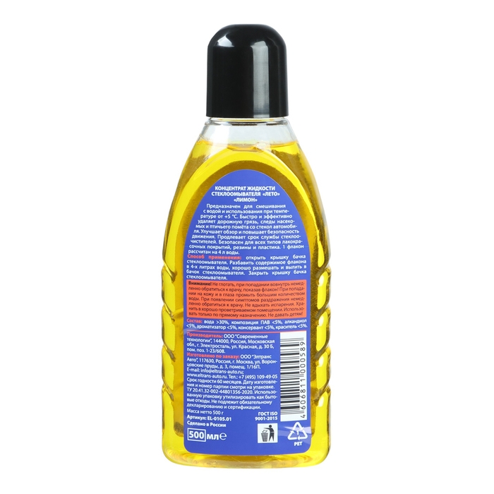 Стеклоомывающая жидкость ЛЕТО, концентрат, 1:8, лимон, 500 мл