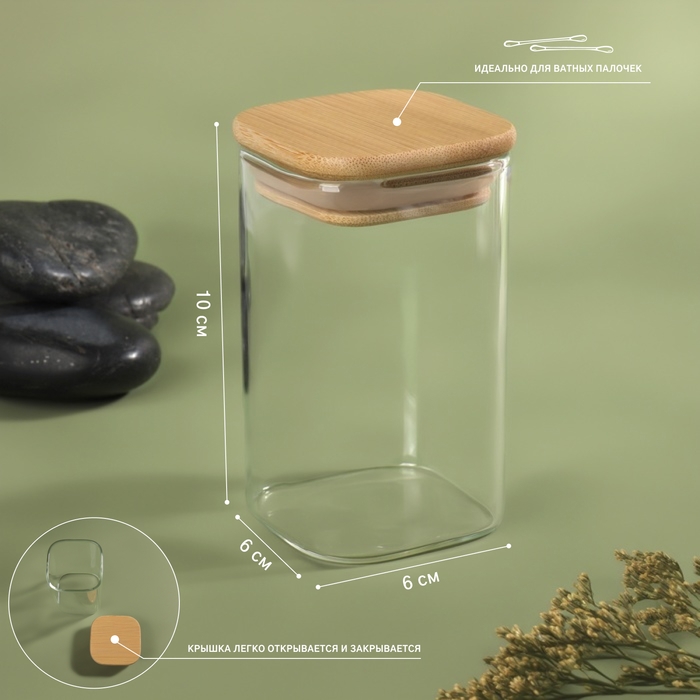 Органайзер для хранения ватных палочек «BAMBOO», с крышкой, 10 × 6 × 6 см, в картонной коробке, цвет прозрачный/коричневый