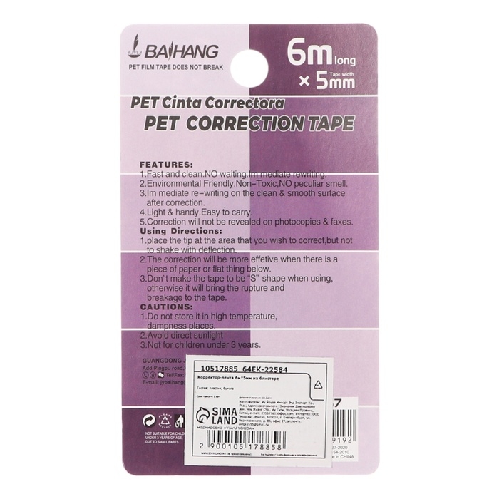 Корректор-лента на блистере, 6мx5мм, Фиолетовый МИКС