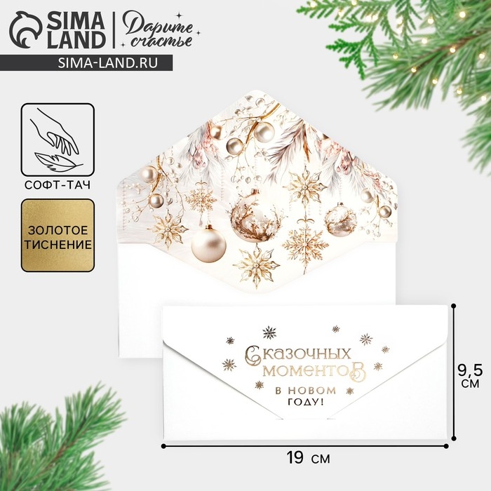 Конверт для денег подарочный «Сказочных моментов», шары, софт тач, тиснение, 19 х 9.2 см, Новый год