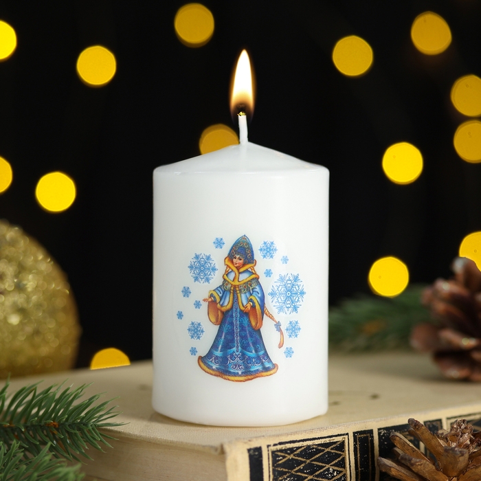 Новый год Свеча столбик с рисунком "Новогодние мотивы" 50*80 мм, Снегурочка