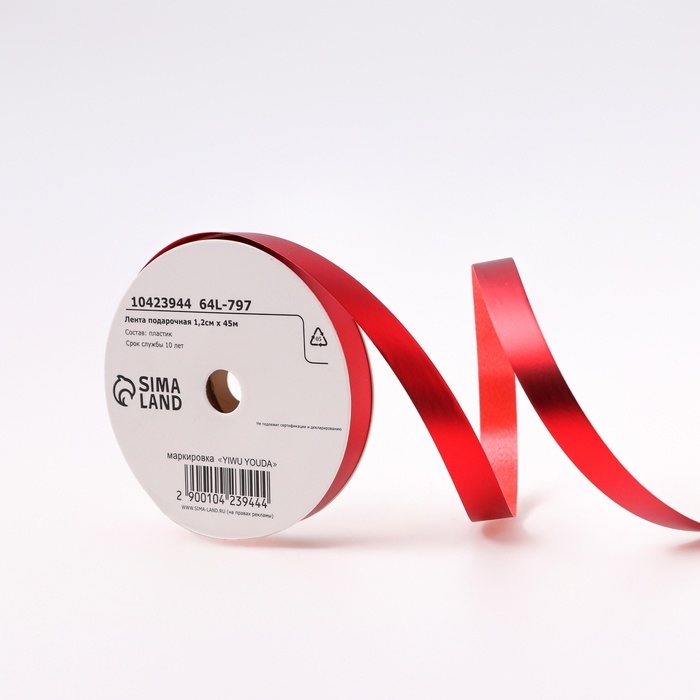 Лента для декора и подарков "Металлик", 1,2см х 45м, красная