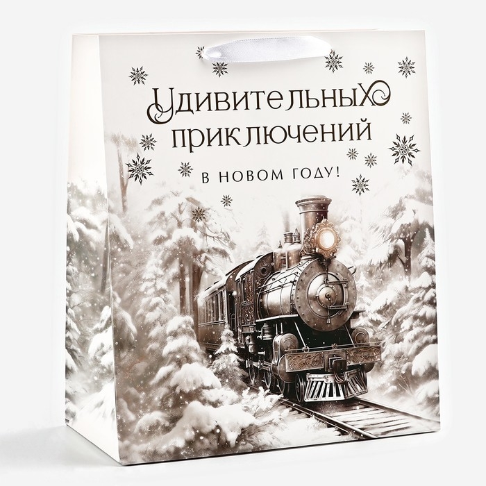 Пакет подарочный новогодний ламинированный «Зимний лес», поезд, тиснение, ML 23 х 27 х 11.5 см , Новый год